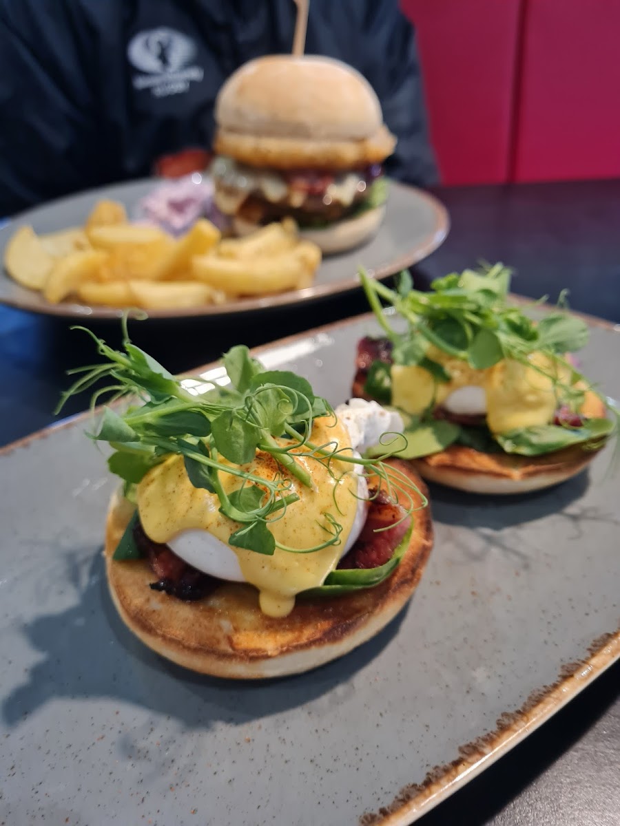 2 poached eggs, smoked bacon, fresh spinach served on a toasted English breakfast muffin, topped with hollandaise sauce.